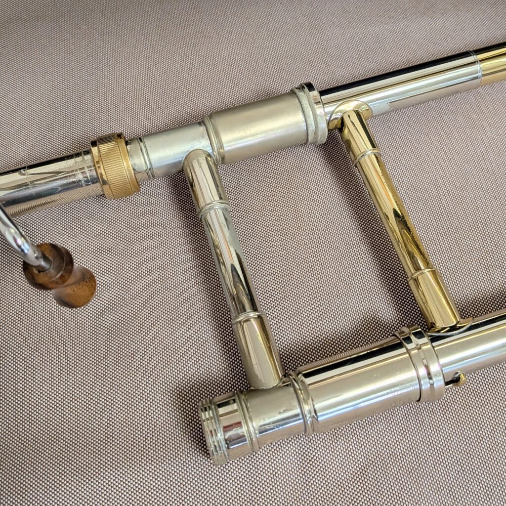 スライド支柱付近を中心にラッカー剥がれが目立つ他、使用に伴う演奏には支障のない範囲の小さな凹みや傷みなどございます。